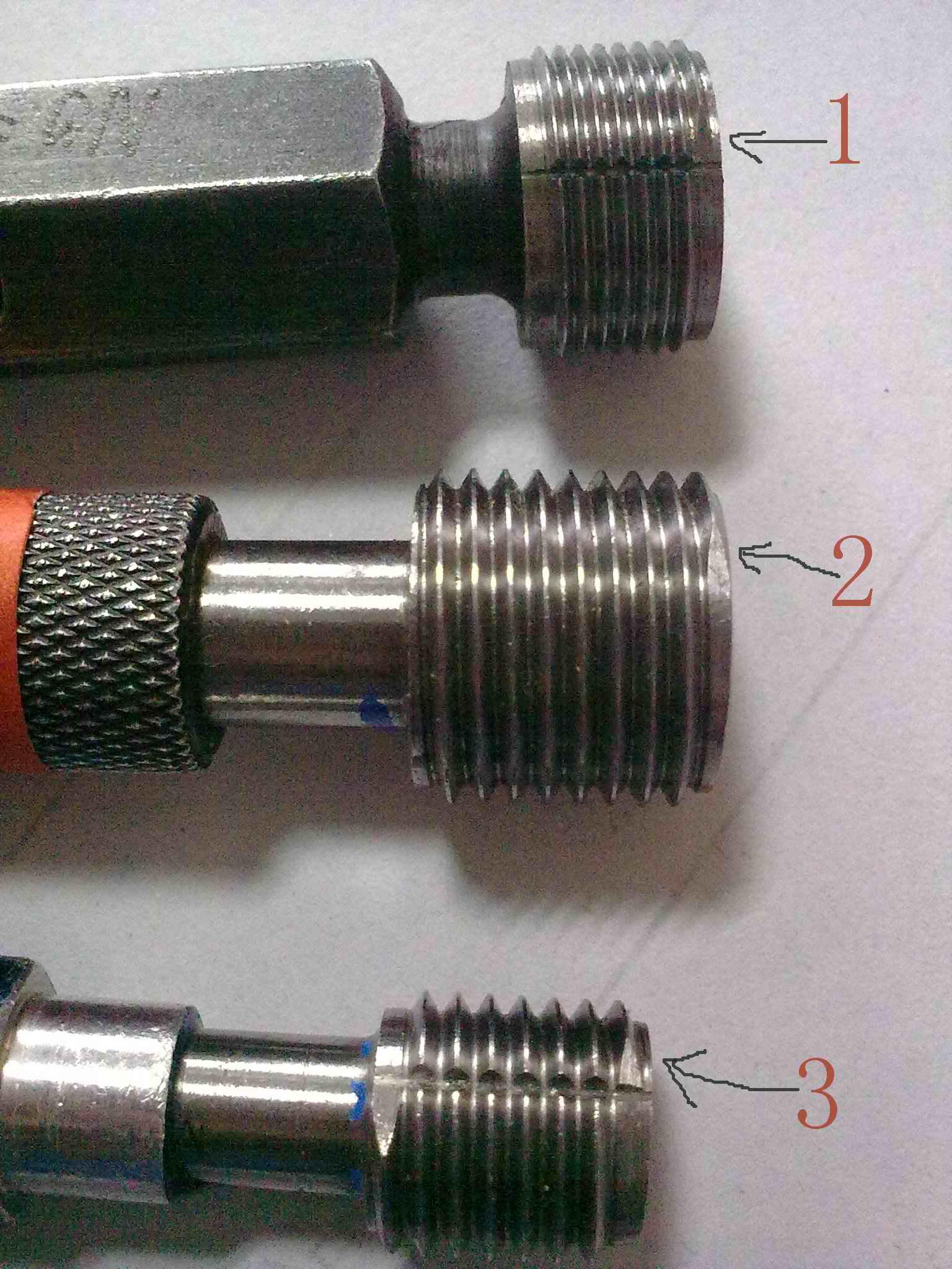 | 沒有導引的(如2),不太好旋進去。第一顆牙容易碰傷產生毛刺,這樣就有可能旋不進去了。解決辦法是:去掉第一顆牙的毛刺或干脆直接將第一顆牙切掉(最好用線割去割,沒有切削力不會對損壞其它螺牙) |