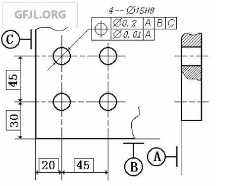 這是一個復合位置度。表示被測要素既要素與A基準面垂直度以及被測要素自身之間的位置誤差者要在公差要求以內。 針對該復合位置度下框部分這樣測: 1、以A基準面建投影面,設為Z工作平面。 2、將被測要素打成圓柱,用這幾個圓柱的質心點建座標(建軸向和歸X、Y零點)。 3、分別評價被測要素軸線兩個端點的位置度,若都在0.01以內則全合格。 |