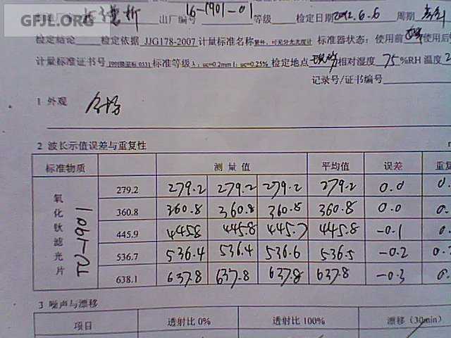 | 鈥玻璃在送到上級計(jì)量部門檢定后,證書背面一般都給出了峰值波長。峰值又分為一級峰、二級峰、參考峰。參考峰、二級峰不太明顯,所以在實(shí)際檢定中,盡可能使用一級峰峰值作為標(biāo)準(zhǔn)。 |