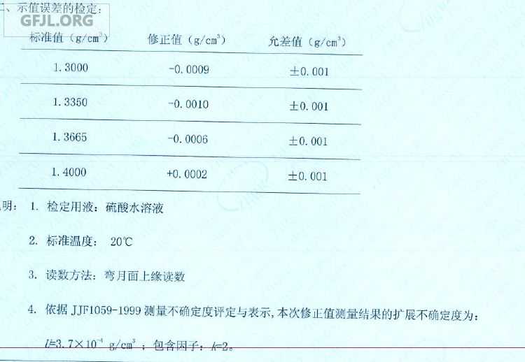 | 如果是想表達密度計上的刻度值,不應該用標準值,我認為應該用標稱值。證書中這一列標準值應該是檢定用液(硫酸水溶液)的標準密度值,修正值是用該標準值減去被檢密度計的示值得到的。即標準值1.3000g/cm 3,密度計示值為1.3009g/cm 3,得到密度計在1.3009g/cm 3處的修正值為-0.0009g/cm 3。在實際使用中,認為密度計在1.3000g/cm 3處的修正值近似為-0.0009g/cm 3。其他點情況一樣。該證書給出的說明4,并沒有嚴格按照JJF1059-1999表示,其給出的不確定度與測量結果(修正值)在小數位數上沒有對齊。不確定度略大于允差絕對值的1/3,其合格判據為誤差(修正值)的絕對值≤MPEV-U95??梢钥闯觯?、4測量點合格,第1、2測量點不能說不合格,而是待定,先不能判斷其合格與否。 |