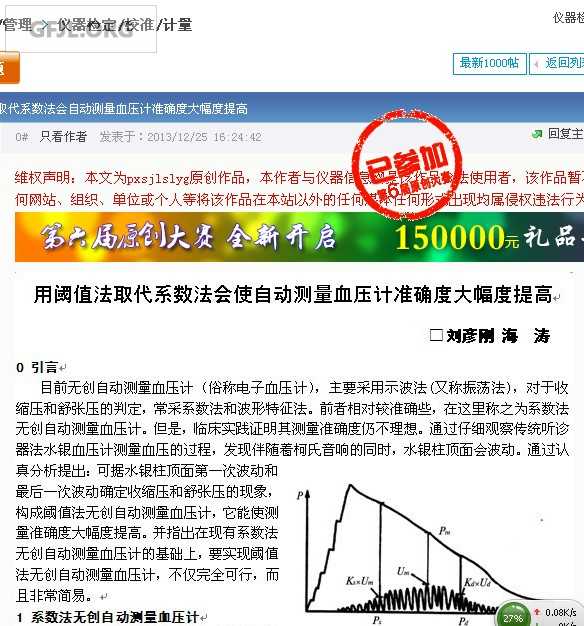 再說我所該次購買的美國福祿克公司無創動態血壓模擬儀吧? 因為早在2011年前我就對無創自動血壓測量有些思考,提出現有的波形系數法原理的無創自動血壓測量不靠譜。 所以當所里剛收到美國福祿克公司無創動態血壓模擬儀,就迫不及待地對其有關的情況進行了了解。經了解發現:當今就是美國福祿克公司的該項儀器,仍是基于我當時指出了不靠譜的波形系數法。因為該系數只是針對被調查人測血壓時,袖帶壓力波形的統計而得。實際上,因為人們還沒有找到關鍵、根本的東西。實際上由于年齡、性別及身體強弱,根本無法用同一系數去判定血壓。所以: 1、因為該該死的系數法,使人們普遍覺得自動血壓計不準。在臨床實踐中,只有醫師不收費的血壓測量用它,真正護士收費的血壓測量,還是用水銀柱血壓計。 2、因為該該死的系數法,使得我們的檢定規程JJG692—2010《無創自動測量血壓計》,只能要求檢定血壓示值重復性,而沒法要求檢定血壓的準確性。因為各無創自動測量血壓計生產廠家,由于各自的考慮側重點不一樣,設定的系數不一樣。如果都按同一個系數去檢,會有很多不合格。但這樣不檢血壓的準確性,又會使得無創自動測量血壓計不準確、甚至錯了,只要每次錯得一樣(重復性好)就是合格的血壓計。 3、因為該該死的系數法,使得我們國家級的計量測試中心,也只能對無創動態血壓模擬儀的靜壓進行校準,而對其輸出的血壓標準值是否準確,根本就沒有發言權。 而因為環保的壓力,唯能讓我們信賴的水銀柱血壓計又不久于人世!人們真得有危急感哦! |