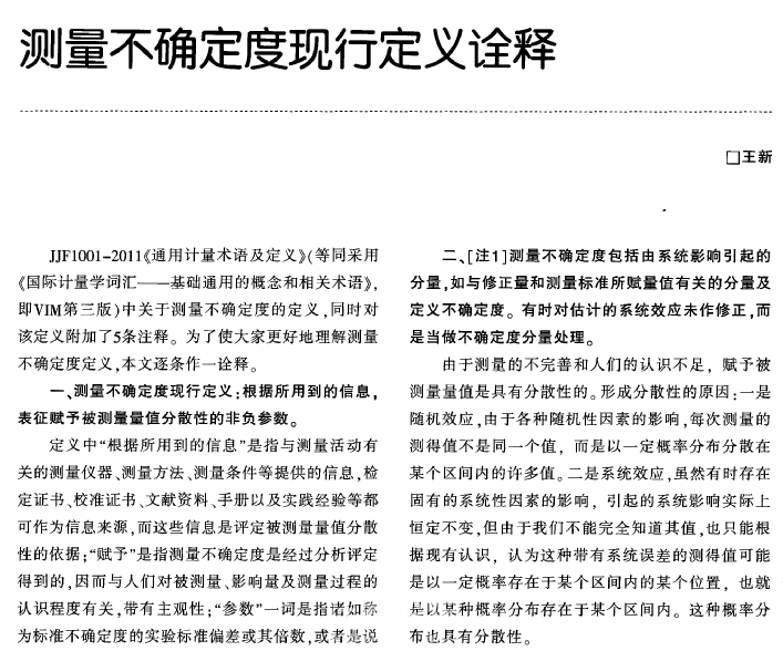 根據所用到的信息,表征賦予被測量量值分散性的非負的參數。 【注1】 測量不確定度包括由系統影響引起的分量,例如與修正量和測量標準所賦量值有關的分量以及定義的不確定度。有時對估計的系統影響未作修正,而是當作不確定度分量處理。 【注2】此參數可以是諸如稱為標準測量不確定度的標準偏差(或其特定的倍數),或者是說明了包含概率的區間的半寬度。 【注3】測量不確定度一般由若干個分量組成。其中一些分量可以根據一系列測量的測量值的統計分布按測量不確定度的A類評定進行評定,并用實驗標準差表征。而另一些分量則可以根據經驗或其它信息假設的概率密度函數按測量不確定度的B類評定進行評定,也用標準偏差表征。 【解釋】(1) VIM-3的定義刪除了“與測量結果相聯系的參數”這一限定,更加合理。在不確定度評定過程中的不確定度分量,諸如由所用的測量儀器或測量系統引起的測量不確定度的分量、由A類評定給出的重復性引起的不確定度分量、引用的有證標準物質或權威機構發布的數據的不確定度分量等等,并不一定作為測量結果發布。 VIM-3的定義中,將“合理地”修改為“根據所用到的信息”。 定義【注1】保留了VIM-2的說明,即測量不確定度包括由系統影響引起的分量,例如與修正量和測量標準所賦量值有關的分量以及定義的不確定度。有時對估計的系統影響未作修正,而是當作不確定度分量處理。 【解釋】(2) 定義【注2】保留了VIM-2的說明。在不確定度評定中,不確定度分量的評定是對“稱為標準測量不確定度的標準偏差”的評定。不確定度以標準偏差作為其尺度,可以用一倍標準偏差表示(標準不確定度)也可以用其倍數表示(擴展不確定度)。 VIM-3將“置信的水平(level of confidence)”修改為“包含概率(coverage probability)”,兩者的概念是一樣的。 【解釋】(3) 定義【注3】保留了VIM-2的說明, 但對評定方法的說明更為具體。 新老定義沒有本質上的區別。 新定義刪除了“與測量結果相聯系的參數”這一限定之后,增加補充了“定義的不確定度(definitional uncertainty)”、 “目標測量不確定度(target measurement uncertainty)”和“儀器的測量不確定度(instrumental measurement uncertainty)”等術語。 |