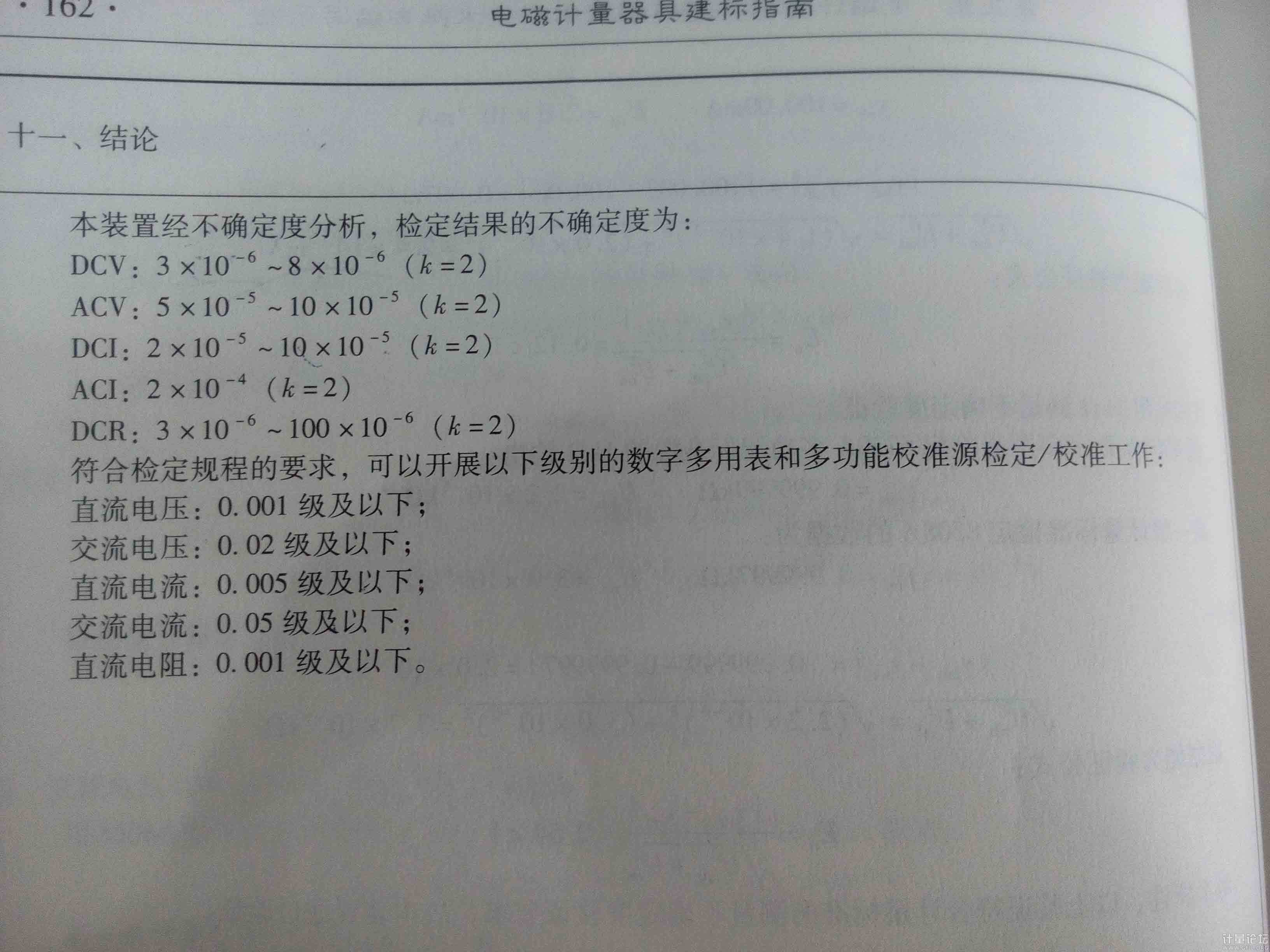 被檢參數的MPEV分別是: DCV:≥1×10^(-5);ACV:≥2×10^(-4);DCI:≥5×10^(-5);ACI:≥5×10^(-4);DCR:≥1×10^(-5)。 按JJF1094規定,檢定方法的不確定度應不大于MPEV的1/3,分別為: DCV:≥3×10^(-6);ACV:≥7×10^(-5);DCI:≥1.7×10^(-5);ACI:≥1.7×10^(-4);DCR:≥3×10^(-6)。 標準裝置實際不確定度分別為: DCV:≥3×10^(-6);ACV:≥5×10^(-5);DCI:≥2×10^(-5);ACI:≥2×10^(-4);DCR:≥3×10^(-6)。 DCV、ACV、DCR的檢測均滿足標準裝置實際不確定度不大于JJF1094規定的檢定方法的不確定度,那本書的判定是正確的。但,DCI、ACI的檢測均滿足標準裝置實際不確定度大于JJF1094規定的檢定方法的不確定度,那本書的判定是錯誤的 |