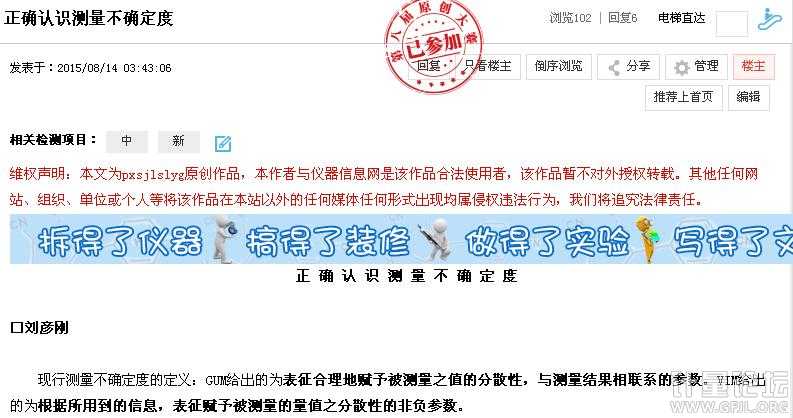 本帖最后由 走走看看 于 2015-8-19 07:19 編輯 劉彥剛 發(fā)表于 2015-8-18 21:31 我對您的“探討”的觀點在您認為”《中國計量》雜志社就我的該《測量不確定度定義的探討》一稿給了我回復,審稿專家肯定了我的觀點!并給出了修改建議,“之后,在您認為”《測量不確定度定義的探討》一稿也得到了李老師的重視!并后來李老師很負責任地給退稿了!“之前,在原主題已經(jīng)表達得很清楚了,現(xiàn)在也沒有什么改變 |
