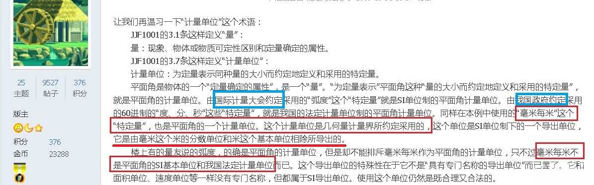 從幾個側(cè)面談一下為什么 “mm/m也是計量單位;而且是SI單位;是我國法定計量單位”的說辭是錯誤的 某些領(lǐng)域專用的平面角計量單位(如密位等)暫且不談。大家都能夠共同認知的平面角計量單位就是兩個,一個是SI單位制中唯一性的平面角輔助單位弧度(rad);另一個就是非SI單位制(制外單位)的,也就是我國允許使用的法定計量單位60進制的“度”、“分”、“秒”。而某位人士心血來潮,“癡人說夢”,非要信口開河瞎講一氣的整出“mm/m也是計量單位;而且是SI單位;是我國法定計量單位”,這樣的錯誤觀點竟然被某版主東扯西繞、胡攪蠻纏的頑固堅持了8年,并在2014年被刊載在某計量雜志上(“解讀”一文)去誤導、忽悠全國計量工作者(某些網(wǎng)站對“解讀”一文給予了轉(zhuǎn)載)。對于某版主錯誤觀點的實質(zhì),本人已依據(jù)國務院《命令》、國家GB3100系列強制性標準及JJF1001法規(guī)性技術(shù)文件給以了駁斥,在事實面前,盡管“煮熟的鴨子嘴硬”,但其已經(jīng)啞口無言、無理可講且已“畏錯潛逃”,即使其偶爾竄蹦出來,胡攪蠻纏幾句,也依然是奄奄一息、無力回天了。批駁的內(nèi)容,大家可以在比比皆是的論壇中查看,本人不再重復。下面僅從幾個側(cè)面再來談論如下: 1. 平面角計量單位的適用范圍 由于從平面角計量單位所具的公共性、合理性、合法性、使用性來看,既然是平面角的計量單位,那就不管是在大、小角度領(lǐng)域,還是在線角度、圓分度,以及平面及空間角度等等領(lǐng)域,應該都可以也能夠使用,而不應該有什么人為的不當限制參雜其中,而弧度(rad)及60進制的“度”、“分”、“秒”就適用于所有平面角領(lǐng)域,但是某版主談及的“mm/m也是計量單位;而且是SI單位;是我國法定計量單位”,可這個“mm/m”竟然如同其所講“用于小角度領(lǐng)域”,或“水平儀上的分度值表示方法”,這就奇怪了,一個“也是計量單位;而且是SI單位;是我國法定計量單位”的“mm/m”在適用場合方面竟然如此的受限,人世間有這樣的不具“公共性、合理性、合法性、使用性”的平面角計量單位嗎? 2. 角度的度量只有角度制(Degree Measure)和弧度制(Radian Measure) 角度制大家都比較清楚,其是60進制的,不屬于SI單位,但屬于我國允許使用的法定計量單位的非SI的制外單位。弧度制是唯一性的SI單位中的平面角輔助單位,也是我國的法定計量單位,弧度制的發(fā)明是希臘的托勒密;弧度制思想的提出是瑞士的歐拉;弧度制的正式提出是北愛爾蘭的湯姆生。弧度(rad)是由 “半徑”(radius)的前四個字母與“角”(angle)的前兩個字母合在一起,構(gòu)成radian,并被人們廣泛接受和引用。我國學者曾把radian譯成“弳’(由“弧”與“徑”兩字的一部分拼成).中華人民共和國成立以來,中學數(shù)學教科書中都把radian譯作“弧度”(rad)。我們再來看“mm/m”這個所謂的平面角“計量單位”,其既不能歸類至角度制,也無法歸類至弧度制,我們只好將其歸類至以某版主命名的“規(guī)角制”。這不倫不類的“規(guī)角制”完全成了游離在角度制和弧度制之外的某版主的“私生子”!這樣的“規(guī)角制”是沒有名分的,其歷史溯源性只能由某版主扯、繞至“陰曹地府”去查找! 3. 某版主所寫并被刊載在某計量雜志上“解讀”一文的審稿人當前的認知 8年的爭論,被“撞南墻”做“擰種”的某版主不管是將他人的正確意見(剽竊后曲解使用),還是其個人的錯誤觀點,完全被其搗成了一鍋漿糊,僥幸蒙騙過關(guān),2014年被刊載在某計量雜志上,從而在全國更大的范圍內(nèi)對從事計量工作的許多新人造成了更大的蓄意誤導!下面我們看一下“解讀”一文的審稿人現(xiàn)在無任何文字改動的認知: ①. 通過審稿再次學習了法定計量單位,借此簡單闡述我對角的計量單位的認識。 ②. 弧度(rad)是國際單位制中具有專門名稱的SI導出單位。因此,它的倍數(shù)單位和分數(shù)單位的SI詞頭使用,應遵守國際單位制中的相關(guān)規(guī)定,如:10-3弧度表示為mrad,10-6弧度表示為μrad。將10-3弧度表示為mm/m,10-6弧度表示為μm/m極易引起歧義和錯誤理解,如:mm/m表示的是毫米/米呢還是毫弧度呢?說不清楚,當表示的是毫米/米就不是角的計量單位,因為角的計量單位在國際單位制中只定義為米/米(rad),沒有第二個計量單位! ③. 我們要嚴格遵守法定計量單位的使用規(guī)定,糾正錯誤的習慣用法,才能避免誤解、誤導、誤用。 由于某版主習慣性的選擇性眼瞎,當其獲知了審稿人的部分“審稿意見”后,“撞南墻”做“擰種”的特質(zhì)壯膽喊出了“不管是什么人所講,都是錯誤的!”,其即不自量力,又喪失了其碼的理智,象一個賭徒似得“輸”紅了眼!告誡某版主:稿費寥寥無幾可以不退,但文責自負不是你能“畏錯潛逃”的了的! 多說下面幾句:審稿人的意見中的一句話“mm/m表示的是毫米/米呢還是毫弧度呢?,當表示的是毫米/米就不是角的計量單位”!這個結(jié)論非常明確。但當“mm/m表示的.....還是毫弧度呢?”對此所問并沒有給出一個結(jié)論,本人現(xiàn)補充如下:首先“mm/m(1/1000)”就是JJF1001中3.26條款的《單位間的換算因子》術(shù)語定義,一詞一義的“換算因子”不可能是“毫弧度”!在標注計量單位時,平面角唯一性的輔助單位弧度(rad)可寫也可不寫,但作為弧度(rad)的十進分數(shù)單位“毫