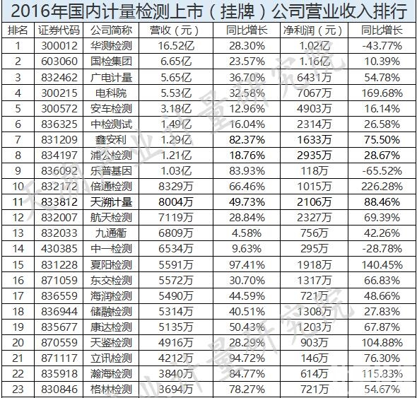 正文摘要:天溯產業計量研究院搜集整理了國內48家計量檢測上市(掛牌)公司2016年年報,發布2016年國內計量檢測上市(掛牌)公司營業收入排行榜,榜單顯示,華測檢測、國檢集團、廣電計量位列收入前三名,國檢集團、華測檢測、 ... |