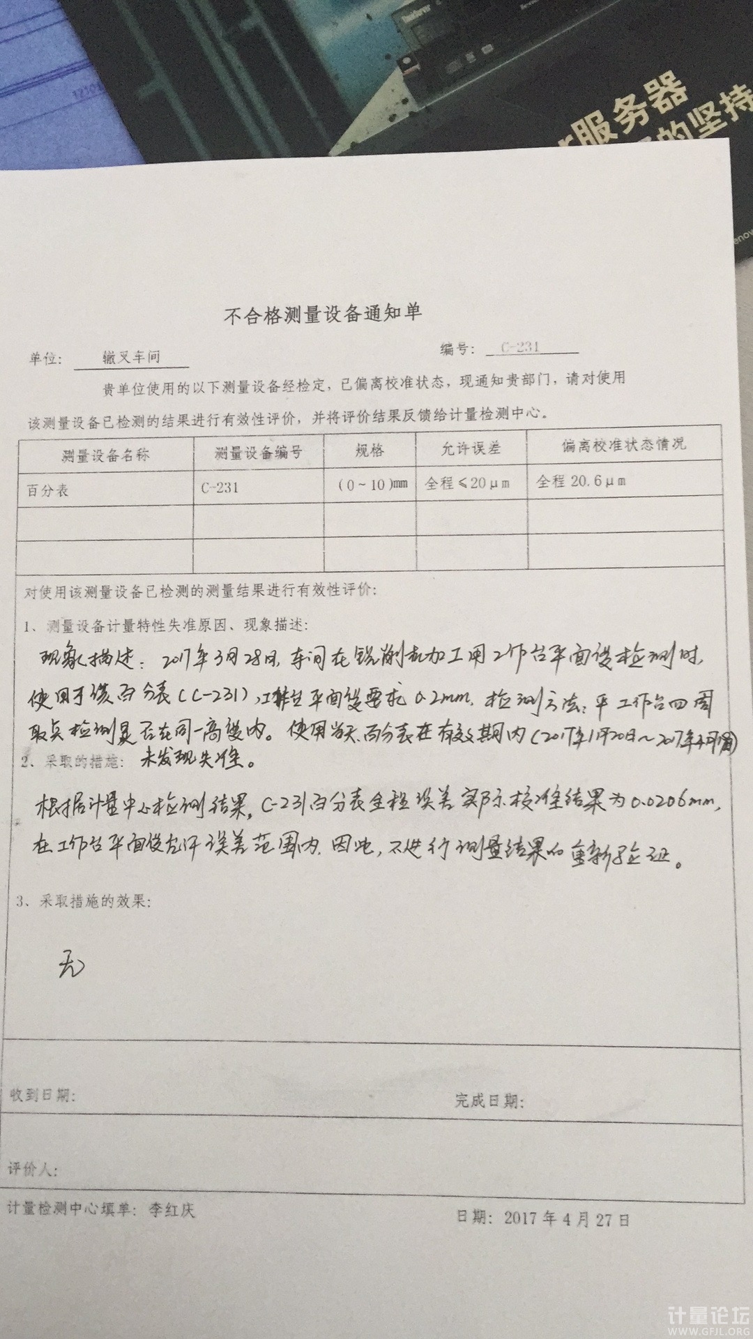 有個百分表在校檢是全程誤差超限,開具了不合格測量設備通知單,請問應該怎么填寫