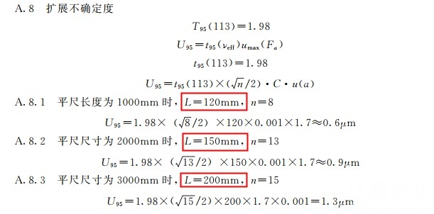 本帖最后由 規矩灣錦苑 于 2018-9-27 15:54 編輯 你給出的信息量太少,不知道此不確定度評定報告到底是怎么寫的,正確與否無法評判。 平尺直線度誤差檢測結果不確定度評定報告,像其它不確定度評定報告一樣,涉及到“測量設備的計量特性給檢測結果引入的不確定度分量”,因此你提出的“橋板跨距的問題”涉及到“測量設備”的定義。 跨距法檢測直線度誤差,使用的測量設備由水平儀和橋板共同組成,水平儀不再是獨立使用的水平儀,橋板也不是獨立使用的橋板。在新的“測量設備”中,水平儀變成了測量設備的“顯示器”,橋板變成了測量設備的“敏感器”和“傳感器”。水平儀獨立使用時是小角度測量儀,分度值為t,計量單位是mm/m(即毫弧度mrad)或角度秒,而組合后的測量設備分度值T為 tL,計量單位是微米μm,其中的L就是橋板的跨距。 你的案例因為被檢平尺長度不同,與水平儀共同組合成新測量設備的橋板跨距L也就不同。它們分別是120mm、150mm、200m。因此,組合測量設備的分度值分別是120t、150t、200t。評定報告的前面部分僅僅是用水平儀的分度值分析了不確定度分量,并非使用組合儀器分度值分析得到,這也就是為什么會出現你用紅筆圈的三處尺寸的原因。 |