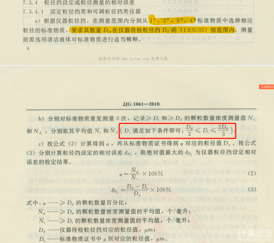 | 這個檢規(guī)已經(jīng)很少用了,適用的范圍太大了。Dt和Dd是粒徑大小通道,一般根據(jù)藥典來定的,一般有10μm、15 μm、20 μm、25 μm等等,還有很多粒徑檔,可以在被檢儀器上選的,根據(jù)Dd就可以確定Dt了,然后分別記下被檢儀器兩檔粒徑讀數(shù)值,再比一下算出α值即可。 |