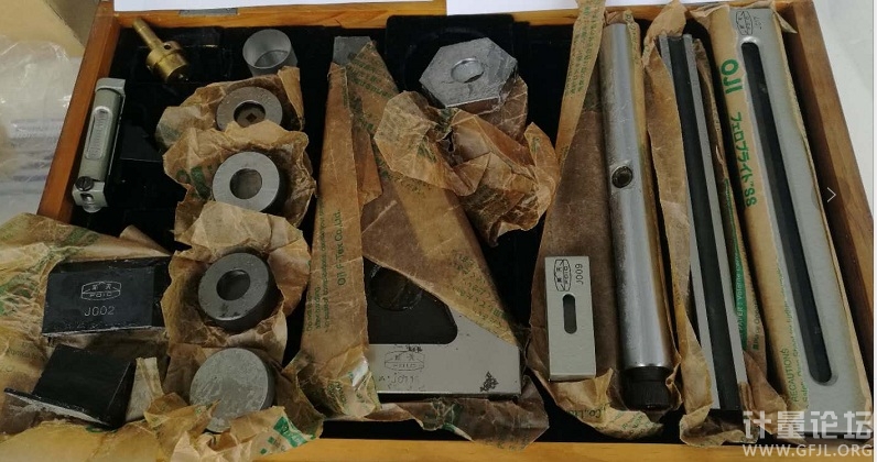 樓主的圖片1,自右向左: 1、200mm玻璃線紋尺; 2、四棱平尺 規格型號:(225×20×20)mm 技術要求:工作面平面度≤1μm,相對兩工作面的平行度:≤2μm; 3、球心刻線芯軸 技術要求:圓柱體的錐度與橢圓度:≤2μm,十字線交點與頂針孔中心線的重合性:在垂直面內≤0.008mm; 5、六面鐵 工作面平面度0.3μm,相鄰兩工作面夾角:120°±2″; 注:該六面鐵不是正多面棱體。其工作面與下非工作面無垂直度要求,其工作角為相鄰兩工作面夾角(120°), 而非像正多面棱體那樣的兩工作面法線夾角(60°) 6、精密直角尺 規格型號:(220×110)mm 技術要求:工作面平面度≤0.5μm,相鄰兩工作面夾角90°±2″; 7、自上往下:①平行平晶 ②十字線分劃板 ③ 方格分劃板 ④同心圓分劃板 ⑤平行塊; 8、自上往下:①小椎體芯軸(缺少莫氏四號的大錐體芯軸) ②水準器 ③ 直角刀口尺 規格型號:(63×40)mm 技術要求:工作棱邊的直線度≤0.5μm,兩工作刃口的夾角90°±2″;④階梯塊 注:各個檢具基本上表面都有銹蝕,估計是使用了凡士林做防銹油造成的,應使用專用防銹油; 各個檢具的使用應依據JJG 56-2017 工具顯微鏡檢定規程。 |