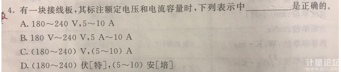 本帖最后由 路云 于 2020-5-28 16:48 編輯 答案A的數字180與計量單位V分離,數字5與計量單位A分離,肯定錯誤,必須用括弧將數字括在一起,使計量單位在括弧外與括號內的數字相乘。 5樓規某沒事都要跳出來胡說八道忽悠誤導大家。你有什么依據說A肯定是錯誤的,D是正確的呀?看看國家標準是怎么說的吧: