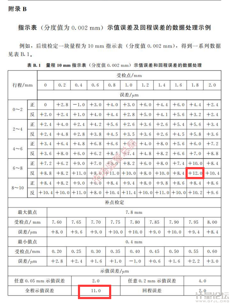 | 正行程各點(diǎn)示值誤差中最大值減最小值。10.0-(-1.0)=11.0 |