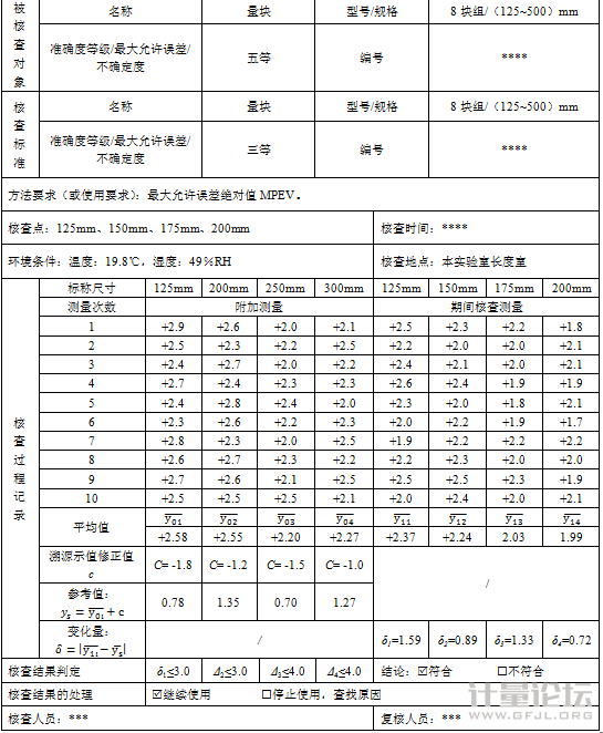 請群友、老師們看到后,請一定指導一下。 1、CNAS-GL042:2019《測量設備期間核查的方法指南》7.1.1 核查標準的參考值已知的情況(作為核查標準的3量塊省院檢定后,查檢定證書中心長度偏差已知);被核查對象5等量塊市計量所檢定后,量塊中心長度偏差也可以查檢定證書得到。 2、單位實驗室未配置量塊測微儀,請問用測長儀作為媒介,可以對5等量塊進行示值誤差期間核查嗎?關于這點實驗室內部,同事們的觀點有分歧。 3、我的想法是不可以,不能用測長儀代替量塊測微儀進行示值誤差核查。 4、如果可以,上述核查記錄表格是否可行? 5、如果不可行,有群友老師能說一說嗎? |