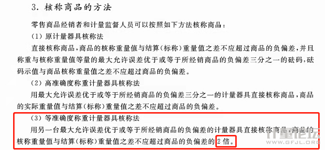 | “用另一臺最大允許誤差優(yōu)于或者等于所經(jīng)銷商品的負(fù)偏差的計(jì)量器具直接核稱商品,”注意看,是最大允差生平于銷售商品負(fù)偏差。首先負(fù)偏差和標(biāo)注凈含量就有一個最大的負(fù)偏差,然后最大允差是±負(fù)偏差。所以最后是2倍 |
