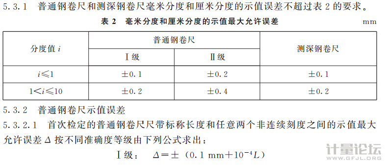 一、毫米分度和厘米分度的示值最大允許誤差是指相鄰的兩條毫米刻線或相鄰的兩條厘米刻線之間的誤差;5.3.2指的是非相鄰兩刻線之間的誤差; 二、兩個非連續刻度指的是不相鄰的兩條刻線,如:第5條毫米刻線和第7、8、9、10……條毫米刻線(第6條除外);如果要全長的誤差,則從0開始,如果要4m~5m的誤差,L取值(5-4)m=1m; 三、10m的鋼卷尺,L取值10000。示值誤差為△=±(0.3+2×0.0001×10000)=±2.3mm; 四、這是規程規定的,如果按照后續檢定示值誤差不變,則按照合格處理。 |