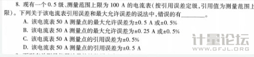 | 個人理解: 題目中明顯沒有一個重要的信息——50A點位的示值誤差△(但是能確定的是,這個示值誤差△必須在±0.5A之間,否則儀器就不合格,不用討論了)。這么來看的話,選項中的引用誤差,是不是指的一個區間呢。也就是說,該電流表在50A點位的引用誤差是±0.5%(引用誤差=△/100A,因為△在±0.5A之間,所以引用誤差也就再-0.5%~+0.5%區間呢) |