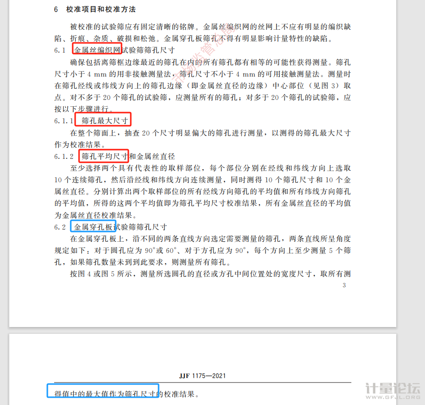 長度室 發表于 2024-3-27 08:43 國內實驗室,不管是授權機構還是經CNAS認可的機構,基本上都是依據JJF 1175試驗篩校準規范,就按照這個規范。 如果客戶指定依據JJF 1175的校準結果,以及提供的試驗篩計量特性指標(表A.2)進行符合性判定,那么根據JJF 1175第6.2條“測量所選圓孔的直徑或方孔中間位置處的寬度尺寸,取所有測得值中的最大值作為篩孔尺寸的校準結果。”直接算出偏差,與表A.2規定的極限偏差要求進行比較,作出符合性判定結論就OK了。 抱歉,這里是我筆誤,實測值應為(mm):2.020、9.962、9.905、9.881、10.005、10.022、9.861、9.902、9.924、9.945。 該組校準測得值中,最大值為10.022 mm,最小值為2.020 mm,校準結果就是10.022 mm,偏差為(2 -10.022) mm=-8.022 mm。超出最大允許偏差±0.09 mm的要求,判定結論為“不合格”。 像這樣的篩,不要說校準了,就是生產廠家出廠檢驗都通不過。 我們(不包括您)討論的就是該校準規范的數據處理合不合理。 這是另外一個問題,只有規范起草人才能作出權威的解釋,說清楚他為什么這么規定。如果客戶和(或)校準機構認為這種數據處理方式不合理,可以溝通協商,是否可以依據GB/T 6003.2-2012《試驗篩 技術要求和檢驗 第2部分:金屬穿孔板試驗篩》第5.2.3條規定的方法(見下圖)進行符合性判定。