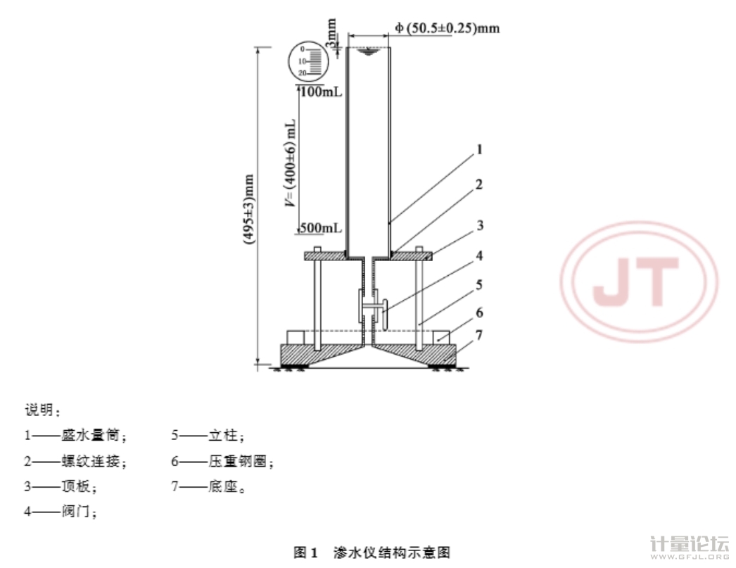 正文摘要:盛水量筒 5.3.1 內徑直徑 (50.5±0.25)mm。 5.3.2 (100~500)mL刻度線間總容積:(400±6)mL。 5.3.3 0mL刻度線到底座底面的距離:(495+3)mm。 |