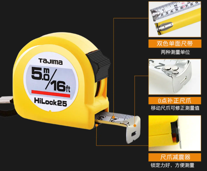 鋼卷尺的主要結(jié)構(gòu)為具有一定彈性的整條尺帶,卷于金屬或塑料材料制成的尺盒或框架內(nèi)。鋼卷尺尺端裝有拉環(huán)或尺鉤;制動(dòng)式卷尺附有控制尺帶收卷的按鈕裝置;測深鋼卷尺的尺端帶有測深尺砣,它與尺帶的連接既可以是固定的,也可以是可拆卸的。