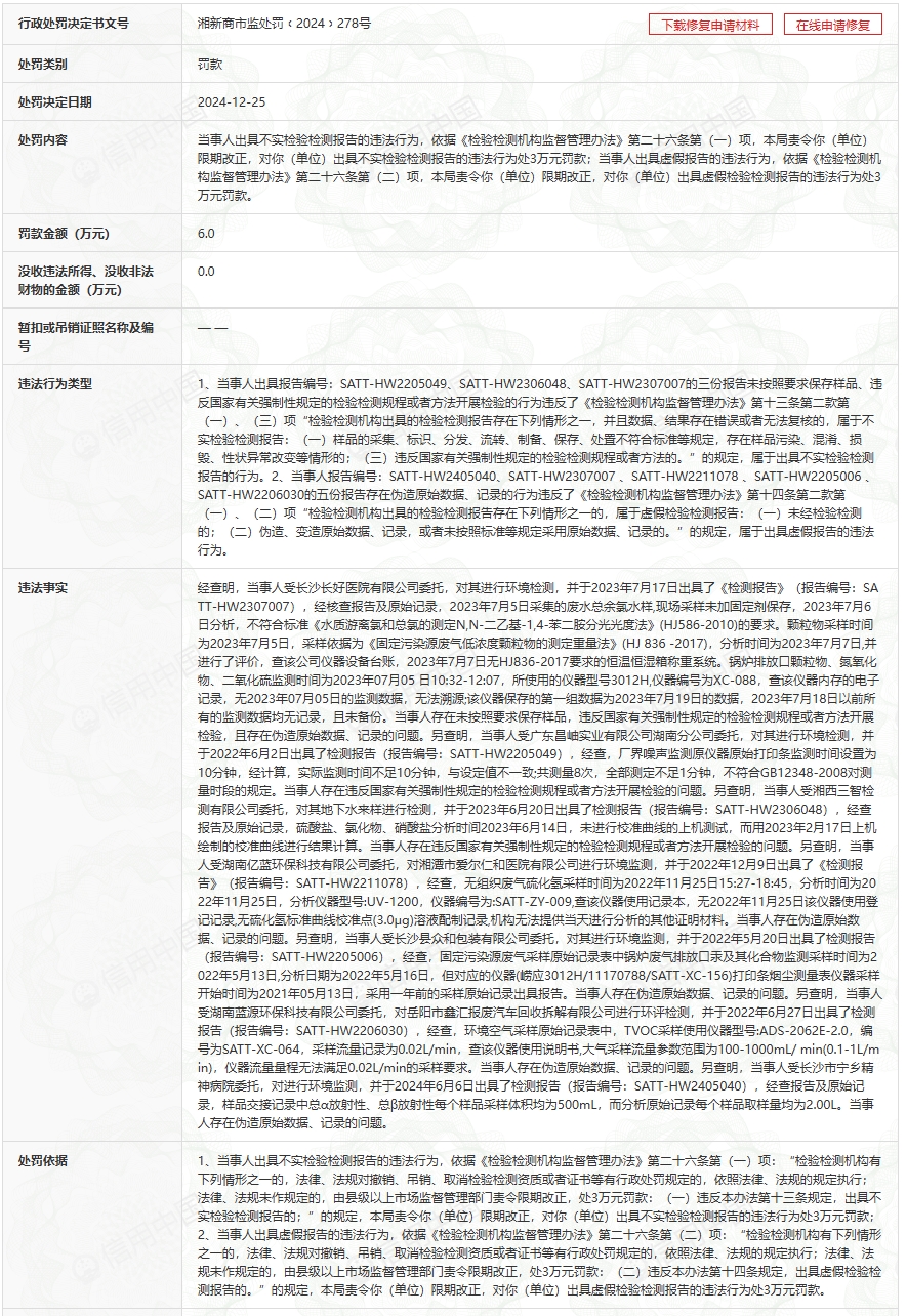 經查明,當事人受長沙長好醫院有限公司委托,對其進行環境檢測,并于2023年7月17日出具了《檢測報告》(報告編號:SATT-HW2307007),經核查報告及原始記錄,2023年7月5日采集的廢水總余氯水樣,現場采樣未加固定劑保存,2023年7月6日分析,不符合標準《水質游離氯和總氯的測定N,N-二乙基-1,4-苯二胺分光光度法》(HJ586-2010)的要求。顆粒物采樣時間為2023年7月5日,采樣依據為《固定污染源廢氣低濃度顆粒物的測定重量法》(HJ 836 -2017),分析時間為2023年7月7日,并進行了評價,查該公司儀器設備臺賬,2023年7月7日無HJ836-2017要求的恒溫恒濕箱稱重系統。鍋爐排放口顆粒物、氮氧化物、二氧化硫監測時間為2023年07月05 日10:32-12:07,所使用的儀器型號3012H,儀器編號為XC-088,查該儀器內存的電子記錄,無2023年07月05日的監測數據,無法溯源;該儀器保存的第一組數據為2023年7月19日的數據,2023年7月18日以前所有的監測數據均無記錄,且未備份。當事人存在未按照要求保存樣品,違反國家有關強制性規定的檢驗檢測規程或者方法開展檢驗,且存在偽造原始數據、記錄的問題。另查明,當事人受廣東昌岫實業有限公司湖南分公司委托,對其進行環境檢測,并于2022年6月2日出具了檢測報告(報告編號:SATT-HW2205049),經查,廠界噪聲監測原儀器原始打印條監測時間設置為10分鐘,經計算,實際監測時間不足10分鐘,與設定值不一致;共測量8次,全部測定不足1分鐘,不符合GB12348-2008對測量時段的規定。當事人存在違反國家有關強制性規定的檢驗檢測規程或者方法開展檢驗的問題。另查明,當事人受湘西三智檢測有限公司委托,對其地下水來樣進行檢測,并于2023年6月20日出具了檢測報告(報告編號:SATT-HW2306048),經查報告及原始記錄,硫酸鹽、氯化物、硝酸鹽分析時間2023年6月14日,未進行校準曲線的上機測試,而用2023年2月17日上機繪制的校準曲線進行結果計算。當事人存在違反國家有關強制性規定的檢驗檢測規程或者方法開展檢驗的問題。另查明,當事人受湖南億藍環保科技有限公司委托,對湘潭市愛爾仁和醫院有限公司進行環境監測,并于2022年12月9日出具了《檢測報告》(報告編號:SATT-HW2211078),經查,無組織廢氣硫化氫采樣時間為2022年11月25日15:27-18:45,分析時間為2022年11月25日,分析儀器型號:UV-1200,儀器編號為:SATT-ZY-009,查該儀器使用記錄本,無2022年11月25日該儀器使用登記記錄,無硫化氫標準曲線校準點(3.0μg)溶液配制記錄,機構無法提供當天進行分析的其他證明材料。當事人存在偽造原始數據、記錄的問題。另查明,當事人受長沙縣眾和包裝有限公司委托,對其進行環境監測,并于2022年5月20日出具了檢測報告(報告編號:SATT-HW2205006),經查,固定污染源廢氣采樣原始記錄表中鍋爐廢氣排放口汞及其化合物監測采樣時間為2022年5月13日,分析日期為2022年5月16日,但對應的儀器(嶗應3012H/11170788/SATT-XC-156)打印條煙塵測量表儀器采樣開始時間為2021年05月13日,采用一年前的采樣原始記錄出具報告。當事人存在偽造原始數據、記錄的問題。另查明,當事人受湖南藍源環保科技有限公司委托,對岳陽市鑫匯報廢汽車回收拆解有限公司進行環評檢測,并于2022年6月27日出具了檢測報告(報告編號:SATT-HW2206030),經查,環境空氣采樣原始記錄表中,TVOC采樣使用儀器型號:ADS-2062E-2.0,編號為SATT-XC-064,采樣流量記錄為0.02L/min,查該儀器使用說明書,大氣采樣流量參數范圍為100-1000mL/ min(0.1-1L/min),儀器流量量程無法滿足0.02L/min的采樣要求。當事人存在偽造原始數據、記錄的問題。另查明,當事人受長沙市寧鄉精神病院委托,對進行環境監測,并于2024年6月6日出具了檢測報告(報告編號:SATT-HW2405040),經查報告及原始記錄,樣品交接記錄中總α放射性、總β放射性每個樣品采樣體積均為500mL,而分析原始記錄每個樣品取樣量均為2.00L。當事人存在偽造原始數據、記錄的問題。 |