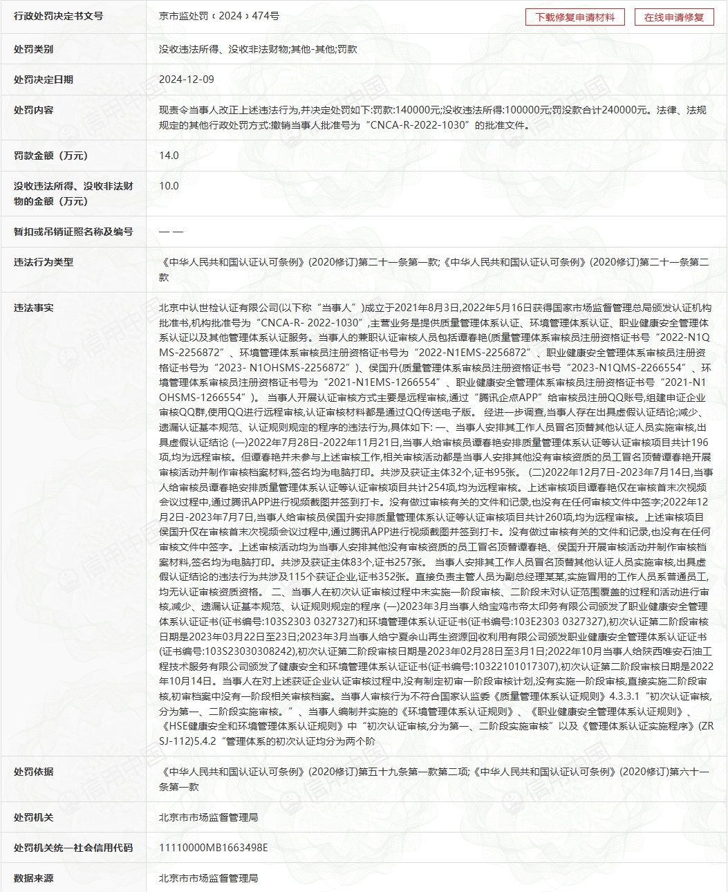 北京中認世檢認證有限公司(以下稱“當事人”)成立于2021年8月3日,2022年5月16日獲得國家市場監督管理總局頒發認證機構批準書,機構批準號為“CNCA-R- 2022-1030”,主營業務是提供質量管理體系認證、環境管理體系認證、職業健康安全管理體系認證以及其他管理體系認證服務。當事人的兼職認證審核人員包括譚春艷(質量管理體系審核員注冊資格證書號“2022-N1QMS-2256872”、環境管理體系審核員注冊資格證書號為“2022-N1EMS-2256872”、職業健康安全管理體系審核員注冊資格證書號為“2023- N1OHSMS-2256872”)、侯國升(質量管理體系審核員注冊資格證書號“2023-N1QMS-2266554”、環境管理體系審核員注冊資格證書號為“2021-N1EMS-1266554”、職業健康安全管理體系審核員注冊資格證書號“2021-N1OHSMS-1266554”)。 當事人開展認證審核方式主要是遠程審核,通過“騰訊企點APP”給審核員注冊QQ賬號,組建申證企業審核QQ群,使用QQ進行遠程審核,認證審核材料都是通過QQ傳送電子版。 經進一步調查,當事人存在出具虛假認證結論;減少、遺漏認證基本規范、認證規則規定的程序的違法行為,具體如下: 一、當事人安排其工作人員冒名頂替其他認證人員實施審核,出具虛假認證結論 (一)2022年7月28日-2022年11月21日,當事人給審核員譚春艷安排質量管理體系認證等認證審核項目共計196項,均為遠程審核。但譚春艷并未參與上述審核工作,相關審核活動都是當事人安排其他沒有審核資質的員工冒名頂替譚春艷開展審核活動并制作審核檔案材料,簽名均為電腦打印。共涉及獲證主體32個,證書95張。 (二)2022年12月7日-2023年7月14日,當事人給審核員譚春艷安排質量管理體系認證等認證審核項目共計254項,均為遠程審核。上述審核項目譚春艷僅在審核首末次視頻會議過程中,通過騰訊APP進行視頻截圖并簽到打卡。沒有做過審核有關的文件和記錄,也沒有在任何審核文件中簽字;2022年12月2日-2023年7月7日,當事人給審核員侯國升安排質量管理體系認證等認證審核項目共計260項,均為遠程審核。上述審核項目侯國升僅在審核首末次視頻會議過程中,通過騰訊APP進行視頻截圖并簽到打卡。沒有做過審核有關的文件和記錄,也沒有在任何審核文件中簽字。上述審核活動均為當事人安排其他沒有審核資質的員工冒名頂替譚春艷、侯國升開展審核活動并制作審核檔案材料,簽名均為電腦打印。共涉及獲證主體83個,證書257張。 當事人安排其工作人員冒名頂替其他認證人員實施審核,出具虛假認證結論的違法行為共涉及115個獲證企業,證書352張。直接負責主管人員為副總經理某某,實施冒用的工作人員系普通員工,均無認證審核資質資格。 二、當事人在初次認證審核過程中未實施一階段審核、二階段未對認證范圍覆蓋的過程和活動進行審核,減少、遺漏認證基本規范、認證規則規定的程序 (一)2023年3月當事人給寶雞市帝太印務有限公司頒發了職業健康安全管理體系認證證書(證書編號:103S2303 0327327)和環境管理體系認證證書(證書編號:103E2303 0327327),初次認證第二階段審核日期是2023年03月22日至23日;2023年3月當事人給寧夏余山再生資源回收利用有限公司頒發職業健康安全管理體系認證證書(證書編號:103S23030308242),初次認證第二階段審核日期是2023年02月28日至3月1日;2022年10月當事人給陜西唯安石油工程技術服務有限公司頒發了健康安全和環境管理體系認證證書(證書編號:10322101017307),初次認證第二階段審核日期是2022年10月14日。當事人在對上述獲證企業認證審核過程中,沒有制定初審一階段審核計劃,沒有實施一階段審核,直接實施二階段審核,初審檔案中沒有一階段相關審核檔案。當事人審核行為不符合國家認監委《質量管理體系認證規則》4.3.3.1“初次認證審核,分為第一、二階段實施審核。”、當事人編制并實施的《環境管理體系認證規則》、《職業健康安全管理體系認證規則》、《HSE健康安全和環境管理體系認證規則》中“初次認證審核,分為第一、二階段實施審核”以及《管理體系認證實施程序》(ZRSJ-112)5.4.2“管理體系的初次認證均分為兩個階