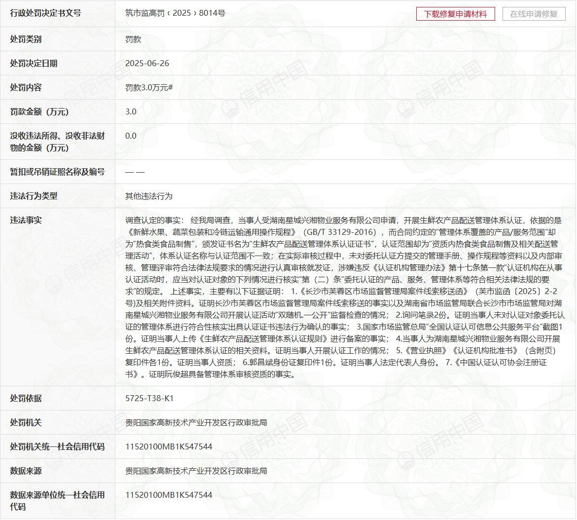 調查認定的事實: 經我局調查,當事人受湖南星城興湘物業服務有限公司申請,開展生鮮農產品配送管理體系認證,依據的是《新鮮水果、蔬菜包裝和冷鏈運輸通用操作規程》(GB/T 33129-2016),而合同約定的“管理體系覆蓋的產品/服務范圍”卻為“熱食類食品制售”,頒發證書名為“生鮮農產品配送管理體系認證證書”,認證范圍卻為“資質內熱食類食品制售及相關配送管理活動”,體系認證名稱與認證范圍不一致;在實際審核過程中,未對委托認證方提交的管理手冊、操作規程等資料以及內部審核、管理評審符合法律法規要求的情況進行認真審核就發證,涉嫌違反《認證機構管理辦法》第十七條第一款“認證機構在從事認證活動時,應當對認證對象的下列情況進行核實”第(二)條“委托認證的產品、服務、管理體系等符合相關法律法規的要求”的規定。 上述事實,主要有以下證據證明: 1.《長沙市芙蓉區市場監督管理局案件線索移送函》(芙市監函〔2025〕2-2號)及相關附件資料。證明長沙市芙蓉區市場監督管理局案件線索移送的事實以及湖南省市場監管局聯合長沙市市場監管局對湖南星城興湘物業服務有限公司開展認證活動“雙隨機.一公開”監督檢查的情況; 2.詢問筆錄2份。證明當事人未對認證對象委托認證的管理體系進行符合性核實出具認證證書違法行為確認的事實; 3.國家市場監管總局“全國認證認可信息公共服務平臺”截圖1份。證明當事人上傳《生鮮農產品配送管理體系認證規則》進行備案的事實; 4.當事人為湖南星城興湘物業服務有限公司開展生鮮農產品配送管理體系認證的相關資料。證明當事人開展認證工作的情況; 5.《營業執照》《認證機構批準書》(含附頁)復印件各1份。證明當事人資質; 6.郭昌斌身份證復印件1份。證明當事人法定代表人身份。 7.《中國認證認可協會注冊證書》。證明阮俊超具備管理體系審核資質的事實。