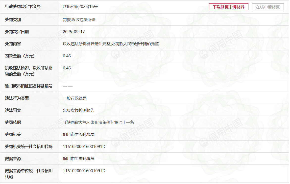 行政處罰決定書文號: 陜B環罰(2025)16號