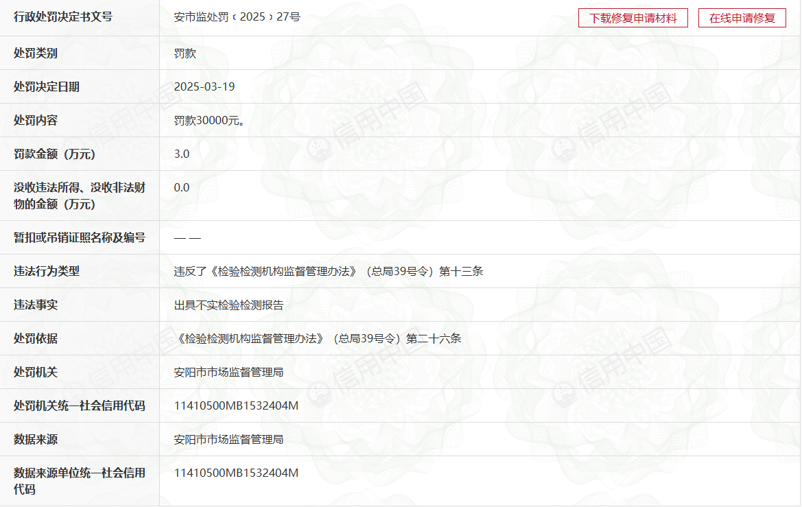 行政相對人名稱: 河南大容檢測科技有限公司